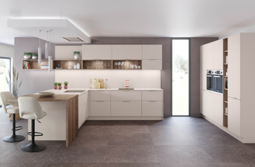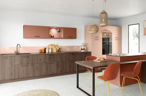 Cette cuisine se distingue par son ambiance douce et chaleureuse. Le mélange subtil des coloris Camel, Blanc polaire soft et Noyer foncé crée une atmosphère enveloppante, parfaite pour un intérieur où confort et esthétisme vont de pair. Les finitions mates et les lignes épurées renforcent cette sensation de calme et de légèreté.