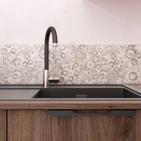 Associée au plan de traval noyer foncé, la crédence stratifiée décor "azulejos taupe" ajoute de la fantaisie, elle est également très facilement lavable. Là encore, fonctionnalité et déco ne font qu'un !