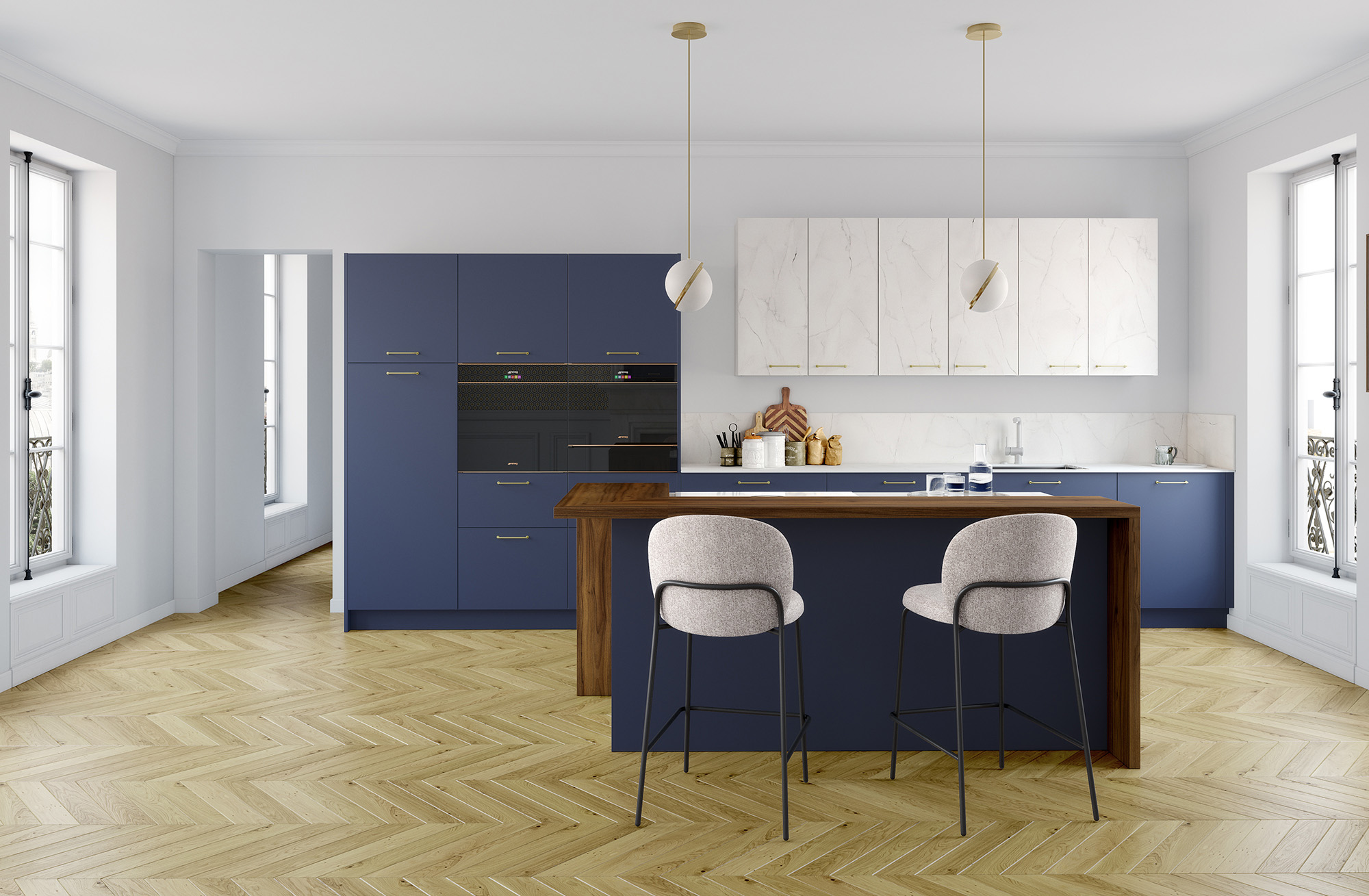 Aussi élégante qu'un salon haussmannien, la cuisine aménagée IDAO bleu saphir s'accompagne de détails raffinés qui lui confèrent un style "classique chic". Surprenez avec une poignée en laiton ou cuivrée et des chaises design, pour une ambiance luxueuse tout en modernité.